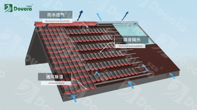 多富瑞波形沥青防水板不仅可以隔绝雨水,在防水板与瓦材间的通风空间还可为建筑隔绝热量。利用空气导热性能弱的原理,在夏季隔绝外部热量,在冬季延缓室内温度流失,使室内温度保持稳定,最终达到降低能耗,减少排放的效果。