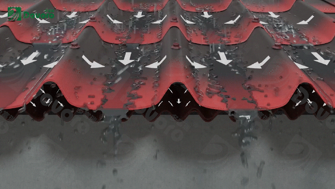 波形沥青瓦与波形沥青防水板,采用沥青作为原材料之一,大大提升瓦材的防水效果。在造型设计上,使用波浪的排水造型,防排结合,提升屋面整体的防水性能。