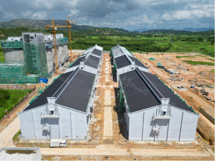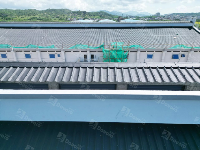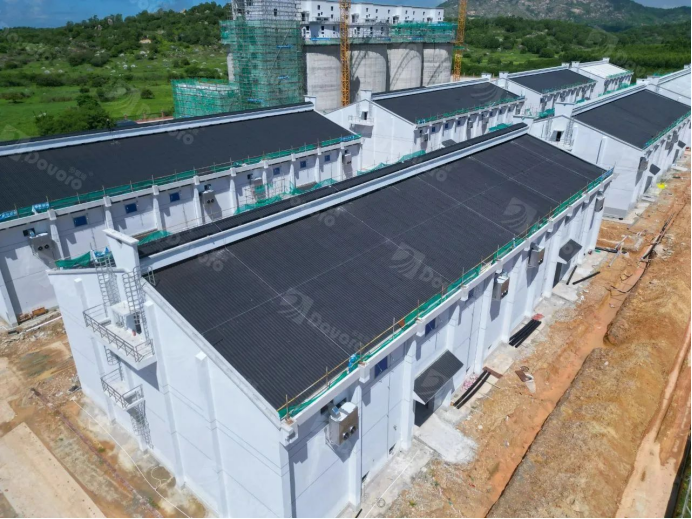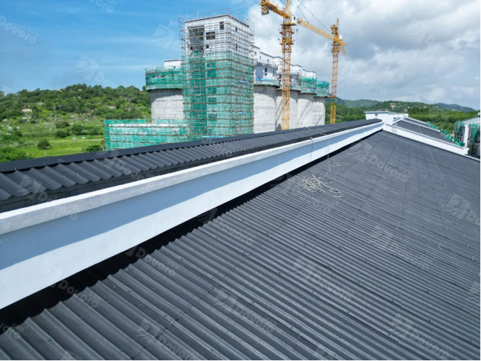 随着国家粮食安全战略的实施,一批高标准粮库在各地兴建,以增强粮食储存能力。本粮库项目位于广东省汕尾市,使用青黛灰幻彩波形沥青瓦,共计约14000平。