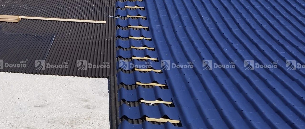 “幻彩”波形沥青瓦与波形沥青防水板组成轻质坡屋面系统,集轻质、防水、透气、隔热、静音、施工便捷等优点为一身。