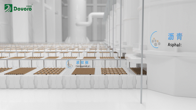 成形的波纹纸板经过传送机,送到了沥青罐中,这正是它蜕变成一块合格的防水板最重要的一步。