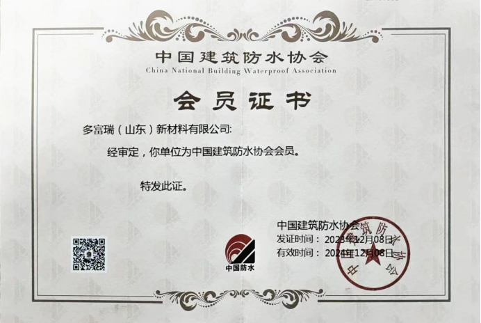 5月,凭借高质量的产品和服务正式成为中国建筑防水协会会员,多富瑞十年如一日,在防水领域的精耕细作,致力于推动防水行业高质量发展,为用户提供更加优秀的解决方案。